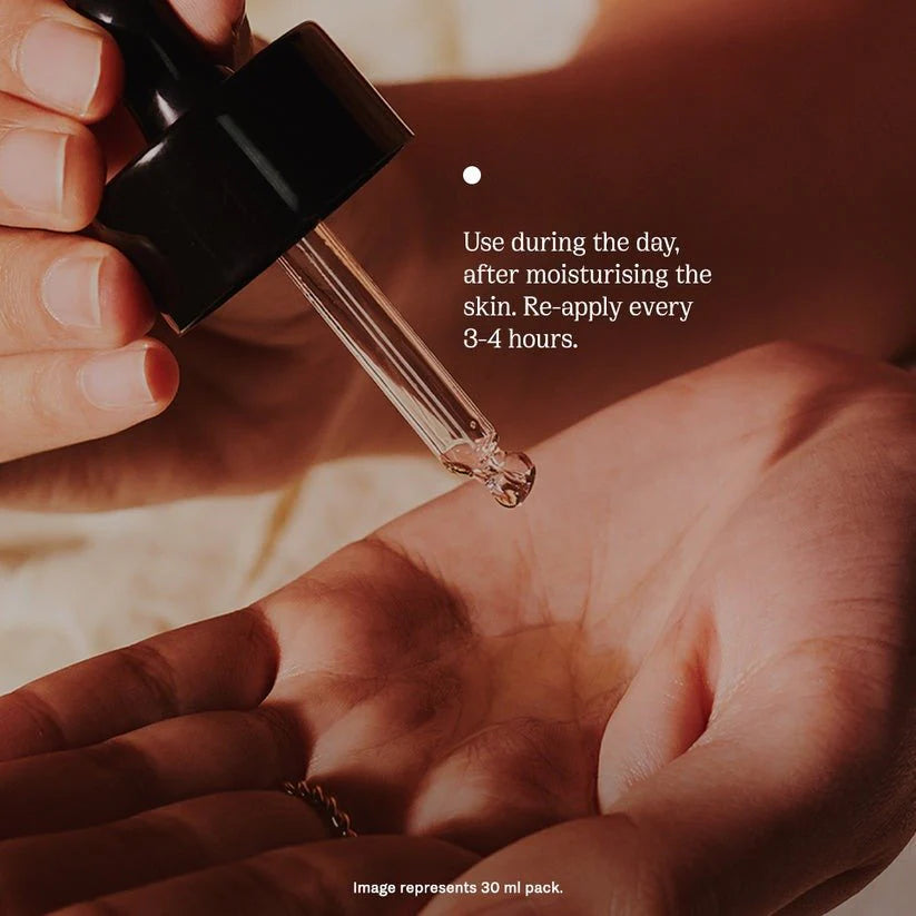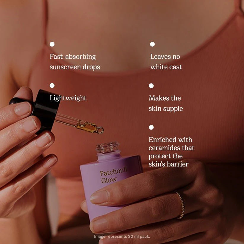 - After moisturizing your skin, take 2-3 drops of Patchouli Glow SPF 40 into the palm of your hand, or more if needed.