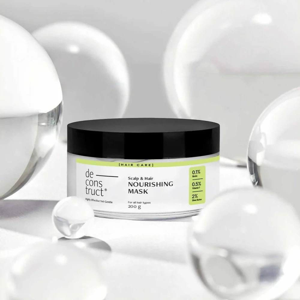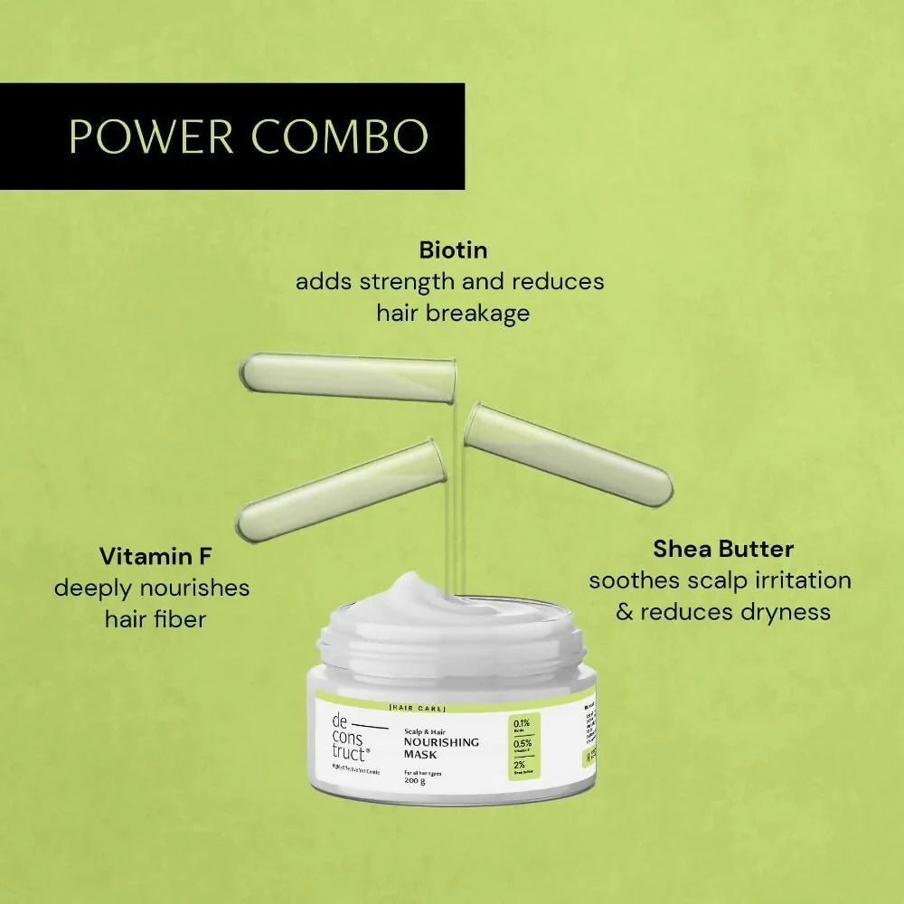 - Deconstruct Scalp and Hair Mask is a hair and scalp conditioning mask that contains nourishing ingredients such as 0.1% Biotin, 0.5% Vitamin F, and 2% Shea butter that deeply nourishes scalp & hair and reduces hair breakage. This moisture-boosting mask helps restore the protein in hair follicles and reduces hair dryness. It enhances the penetration of active ingredients in the formulation that soothes scalp irritation and keeps the hair soft and shiny.