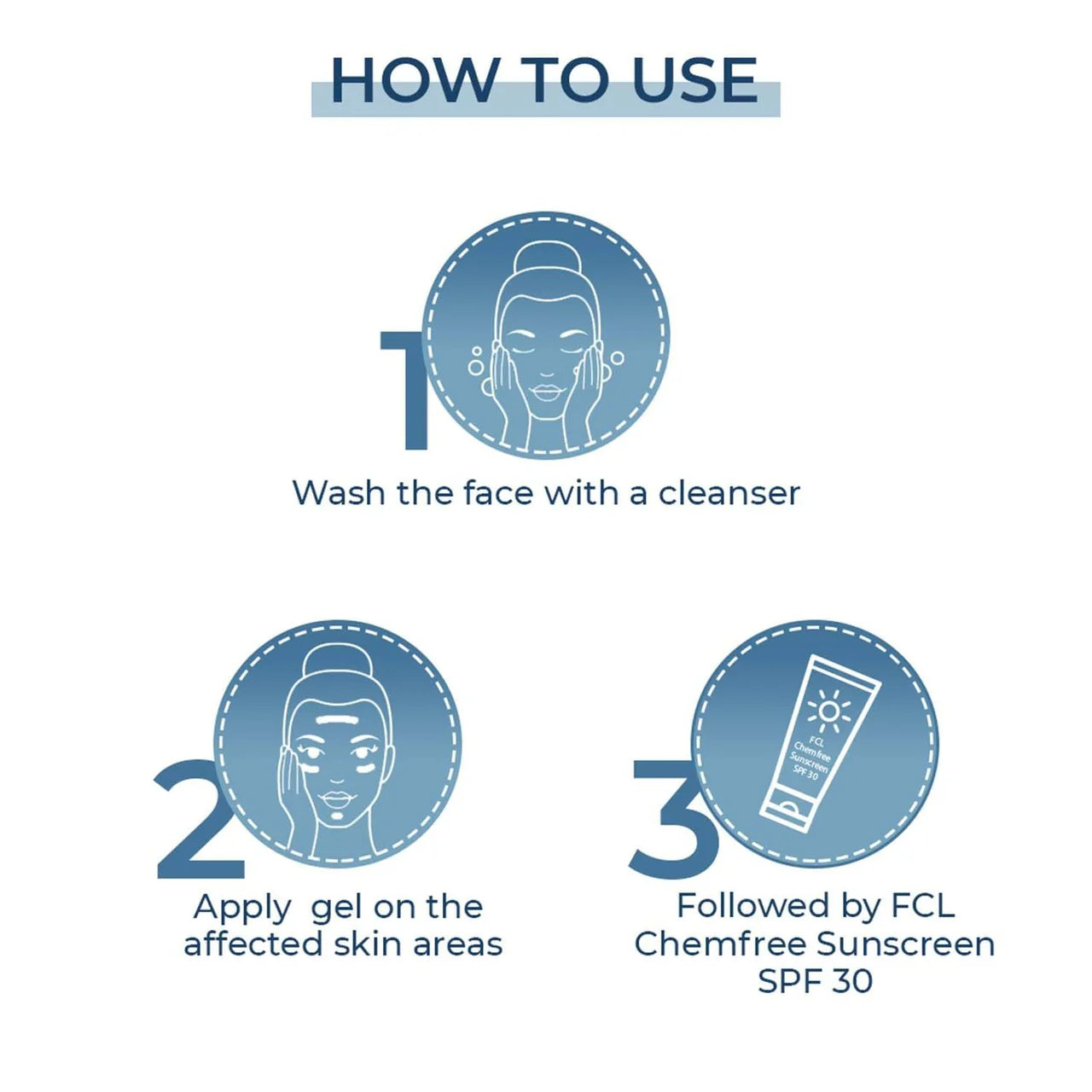 - Wash the face with a cleanser and apply sufficient quantity of gel on the affected skin areas, followed by FCL Chemfree Sunscreen SPF 30 in the day time.