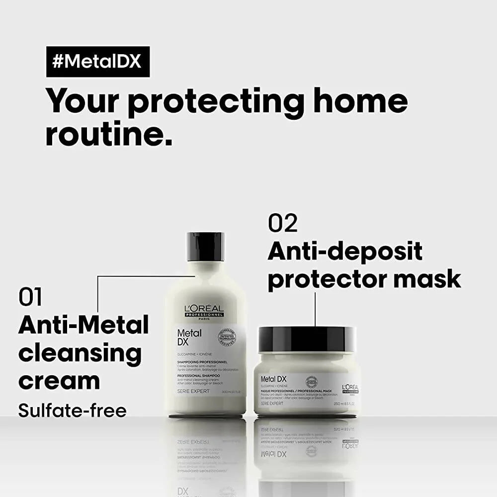 - The level of metal in hair varies, depending on hair porosity and on the water quality where we live. This patented technology with no sulfate is enriched with Glicoamine, a molecule small enough to penetrate and neutralize metal INSIDE the fiber. Hair is healthy looking and recovers its shine. For optimal results, follow with Metal DX anti-deposit protector mask to protect the fiber from particle deposits. To pro guarantee you color, balayage or lightening services ask for your 3-step in salon Metal DX protocol for 100% reliable color result* 87% less breakage risk.