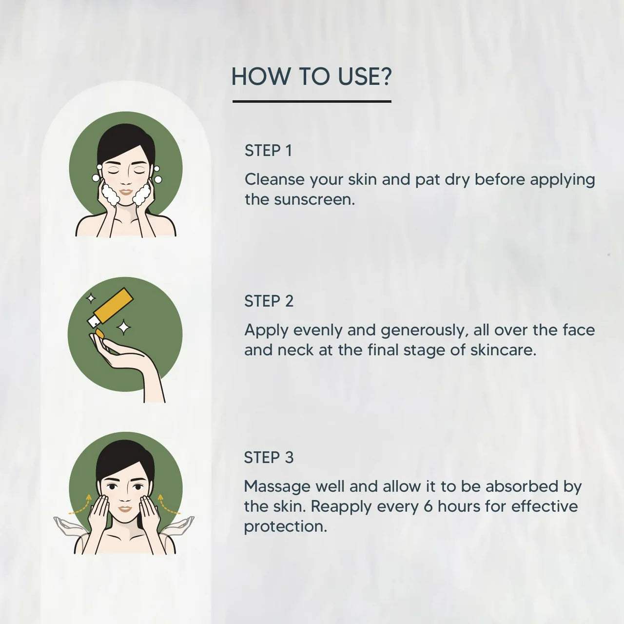 - Apply on cleansed face, neck, arms & all other exposed parts of the body before stepping out in the sun. Repeat frequent applications for maximum protection.