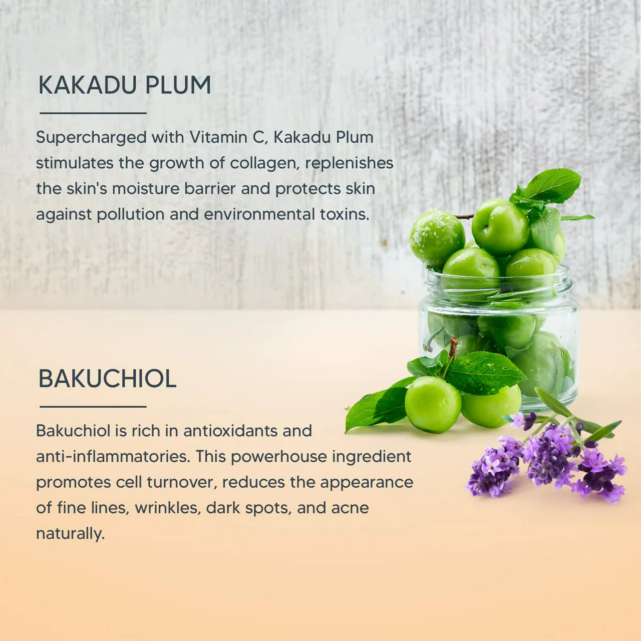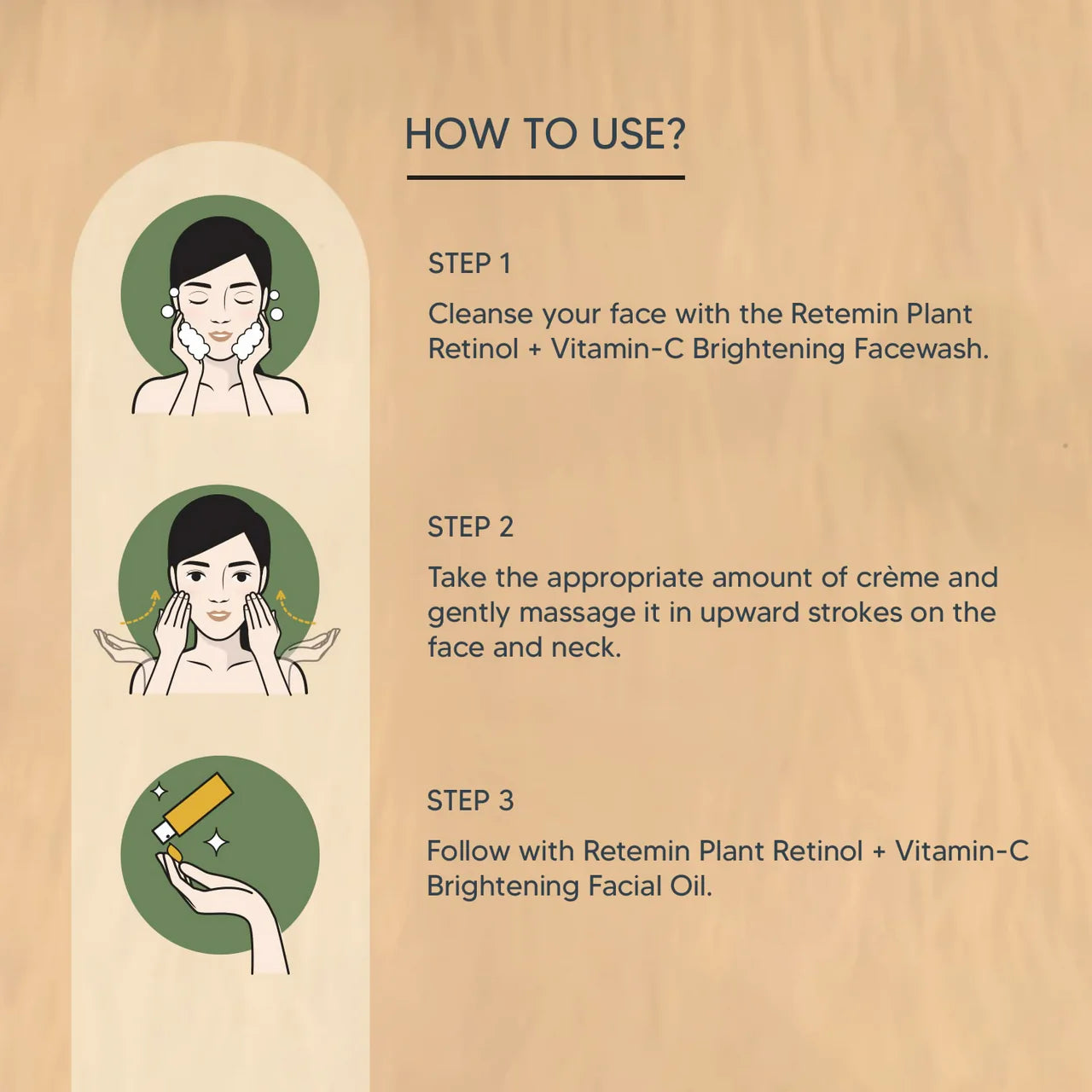 - Retimen - C Plant Retinol + Vitamin-C Brightening Boost Night Creme with natural Vitamin C derived from Kakadu Plum And Bakuchiol extracts ( Plant Retinol) helps charge your skin to let you take on your day with confidence. It locks moisture into your skin to let you wake up with fresh skin that glows from within. It also quenches your skin with hydration the appearance of your skin and giving it a radiant boost. It is a gentle formulation free from harmful chemicals like parabens, mineral oils, silicones, & other toxins