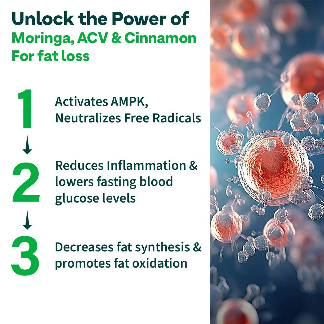 3-IN-1 FAT OXIDATION FORMULA: The combined impact of Apple Cider Vinegar with 6% Acetic Acid, Moringa leaf extracts, and Cinnamon bark extracts, makes this 3-in-1 formulation ideal for efficient fat oxidation or the break-down of fats in the body, which later converts into energy.
