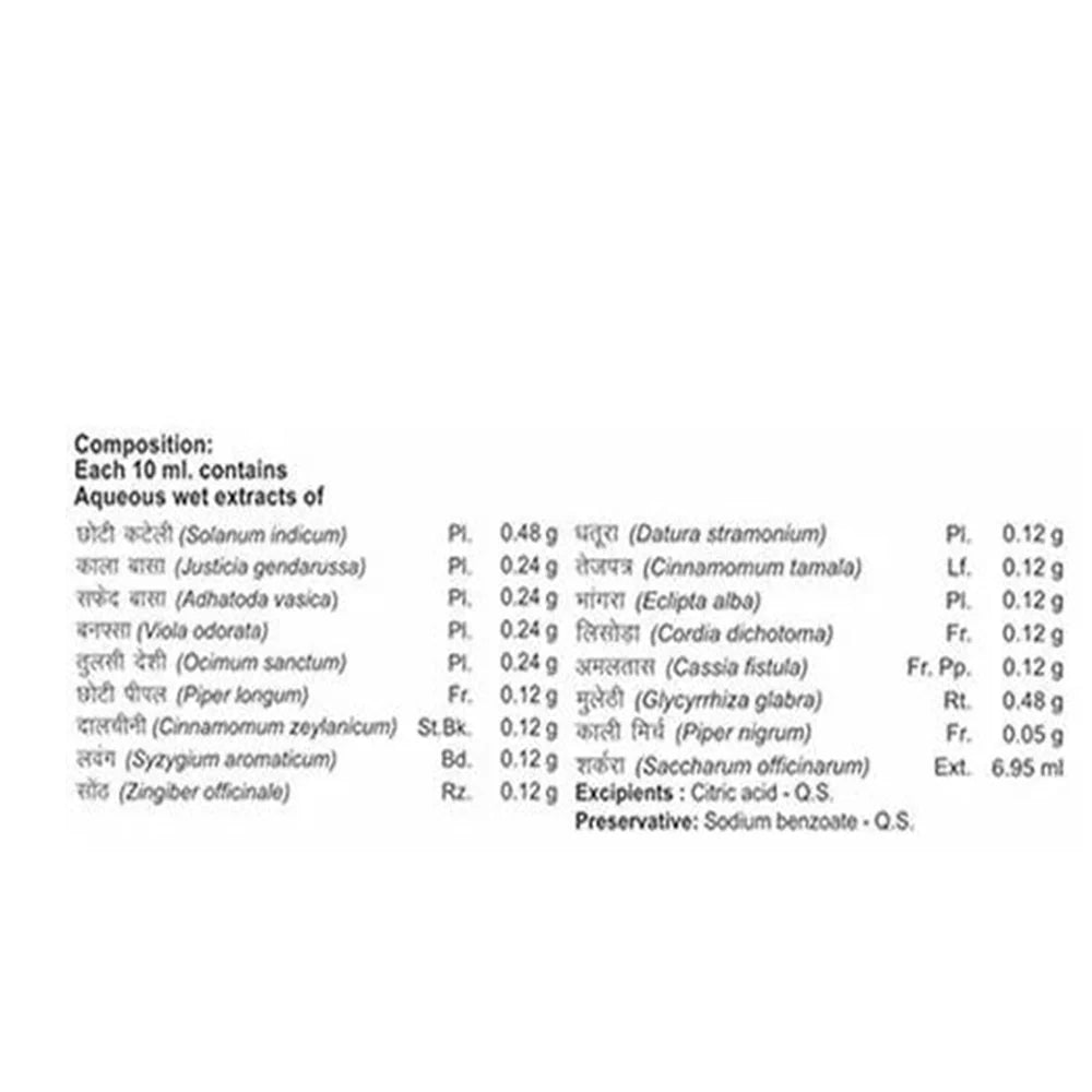 Kali mirch (black pepper), bhringraj (eclipta alba), tejpatra (cinnamomum tamala), sonth (zingiber officinale), lavang (syzgium aromaticum), dalchini (cinnamomum zeylanicum), mulethi (glycyrrhiza glabra), chhoti pipal (piper longum), tuls.