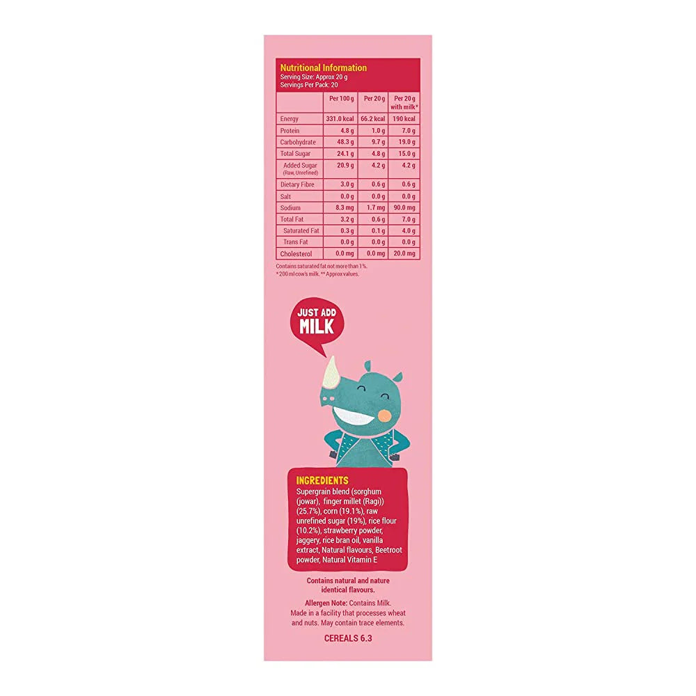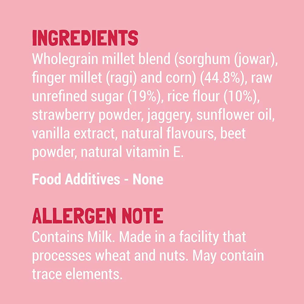 Wholegrain Millets (Sorghum (Jowar) And Finger Millet (Ragi)), Corn, Raw Unrefined Sugar, Rice, Strawberry Powder, Jaggery, Sunflower Oil, Vanilla Extract, Natural Flavours, Beetroot Powder, Natural Vitamin E