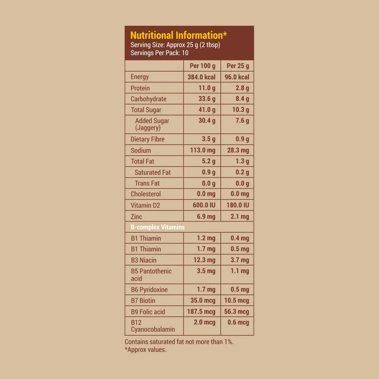 - Power blend (jowar flour (sorghum), oat flour, skimmed milk powder), jaggery, nature identical flavours, rice bran oil, malt powder, tamarind gum, guar gum, vitamins & minerals (B vitamins, zinc and vitamin D)