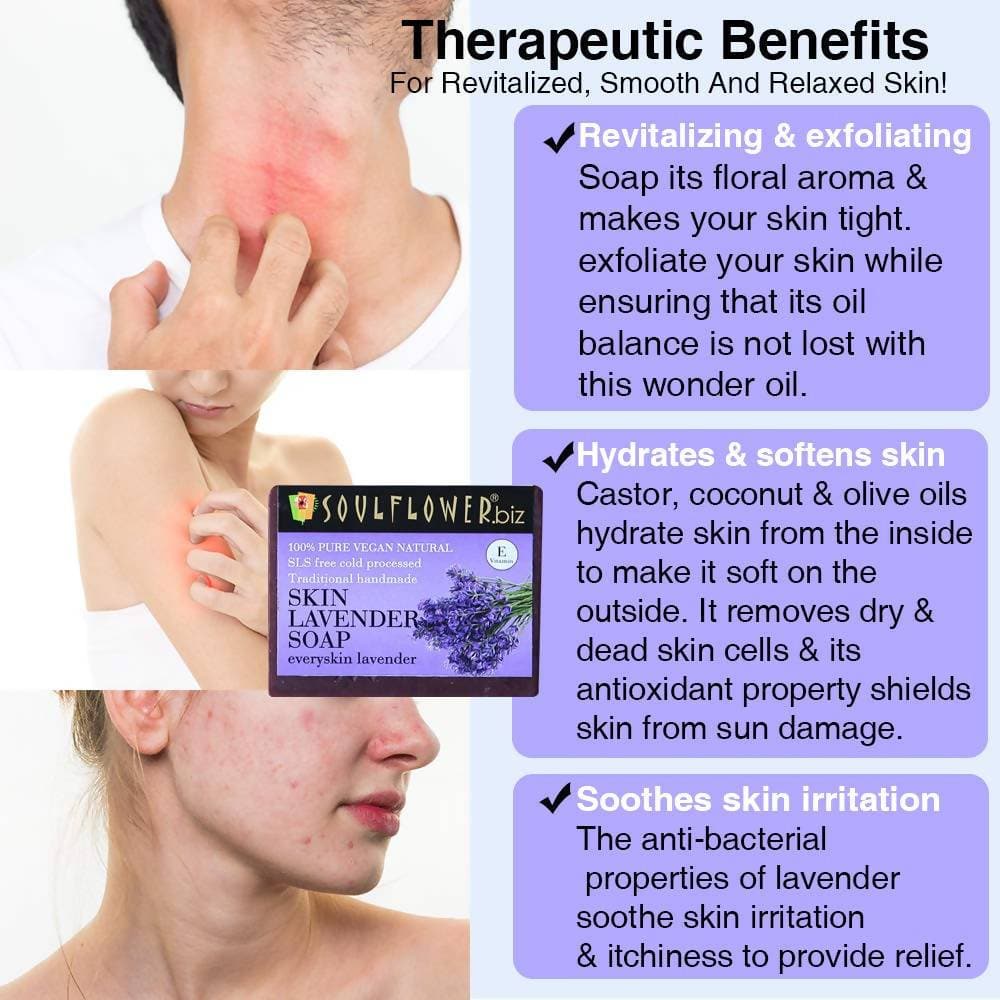Rich lather and a wonderful scent: soulflower skin lavender soap is a mild soap with a rich lather and a wonderful scent, great for toning. lavender contains great value in helping the skin heal itself, preventing scarring, and balancing the production of oil while at the same time helps for all skin.