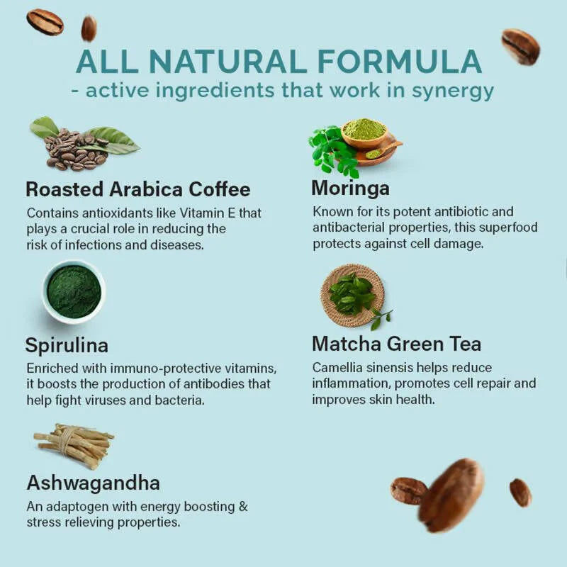 - Roasted Arabica Coffee Extract, Moringa Extract, Spirulina Powder