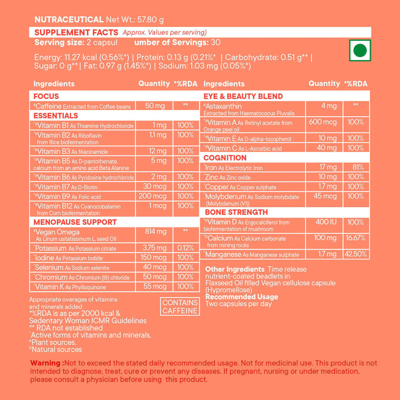 - A scientifically-developed multivitamin for women posts menopause with nutrients to support healthy aging from within. These multivitamin capsules for women combine the most powerful neuroscience with fast-absorbing flaxseed oil & slow-release plant-based multivitamin beadlets with astaxanthin and vegan omega.